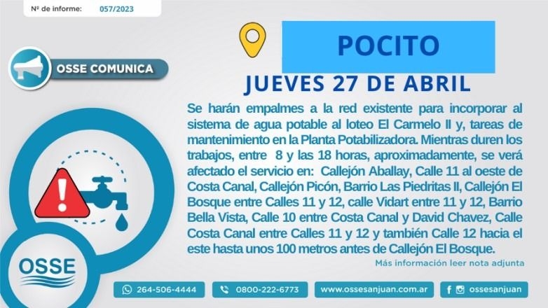 Por otra parte, OSSE dotará de suministro al loteo El Carmelo II en Pocito. Allí, los trabajos se llevarán a cabo entre las 8 y las 18 horas, afectando zonas de Callejón Aballay, Calle 11 al oeste de Costa Canal, Callejón Picón, Barrio Las Piedritas II, Callejón El Bosque entre Calles 11 y 12, calle Vidart entre 11 y 12, Barrio Bella Vista, Calle 10 entre Costa Canal y David Chavez, Calle Costa Canal entre Calles 11 y 12 y también Calle 12 hacia el este hasta unos 100 metros antes de Callejón El Bosque.