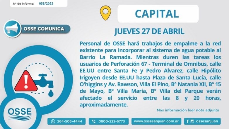 Este miércoles, OSSE (Obras Sanitarias Sociedad del Estado dio a conocer que por trabajos de dotación y mejoramiento del suministro de agua potable en distintos barrios, tres departamentos de San Juan no contarán con el servicio durante este jueves 27 de abril.