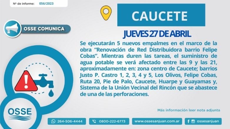 El suministro se interrumpirá de manera momentánea en la Zona centro de Caucete, barrios Justo P. Castro 1, 2, 3, 4 y 5, Los Olivos, Felipe Cobas, Ruta 20, Pie de Palo, Caucete, Huarpe y Guayamas y el sistema de la Unión Vecinal del Rincón que se abastece de una de las perforaciones.