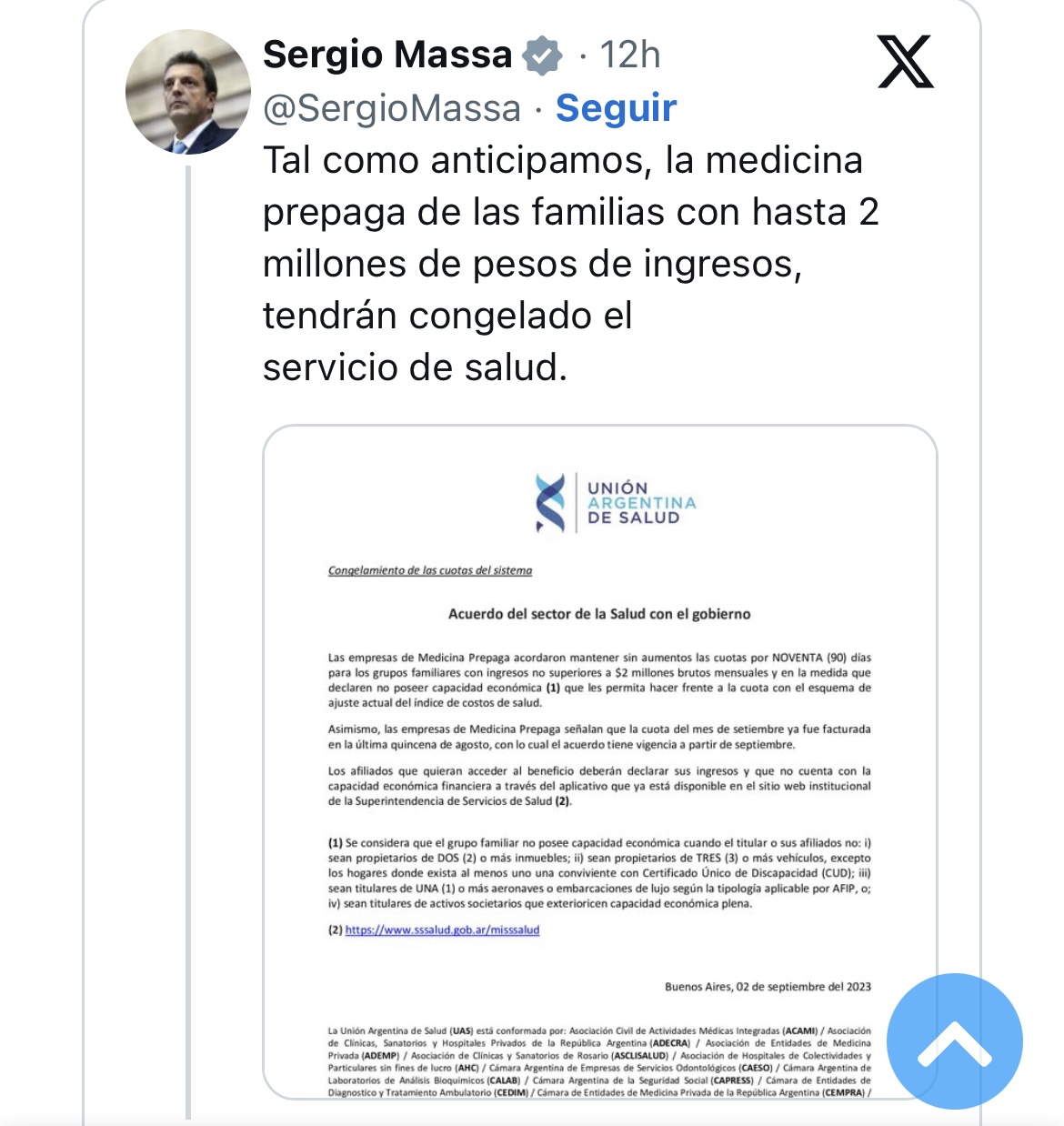 El ministro posteó en su publicación un comunicado de la Unión Argentina de la Salud, en el que que se brinda precisiones sobre este acuerdo que permitirá a grupos familiares "con ingresos salariales mensuales menores a los dos millones de pesos y en la medida que declaren no poseer capacidad económicahacer frente a la cuota con el esquema de ajuste actual del índice del costo de salud".