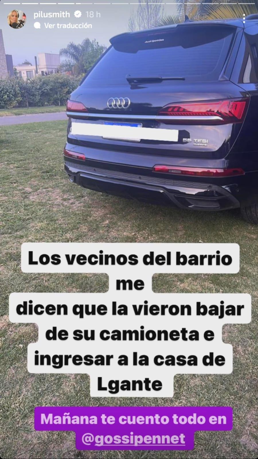 Las imágenes fueron tomadas por los vecinos del barrio privado San Joaquín. “Wanda ahora en la casa de L-Gante. Ahora en el barrio Don Joaquín”, escribió Pilar Smith en sus historias de Instagram, y agregó: “Los vecinos del barrio me dicen que la vieron bajar de su camioneta e ingresar a la casa de L-Gante”.