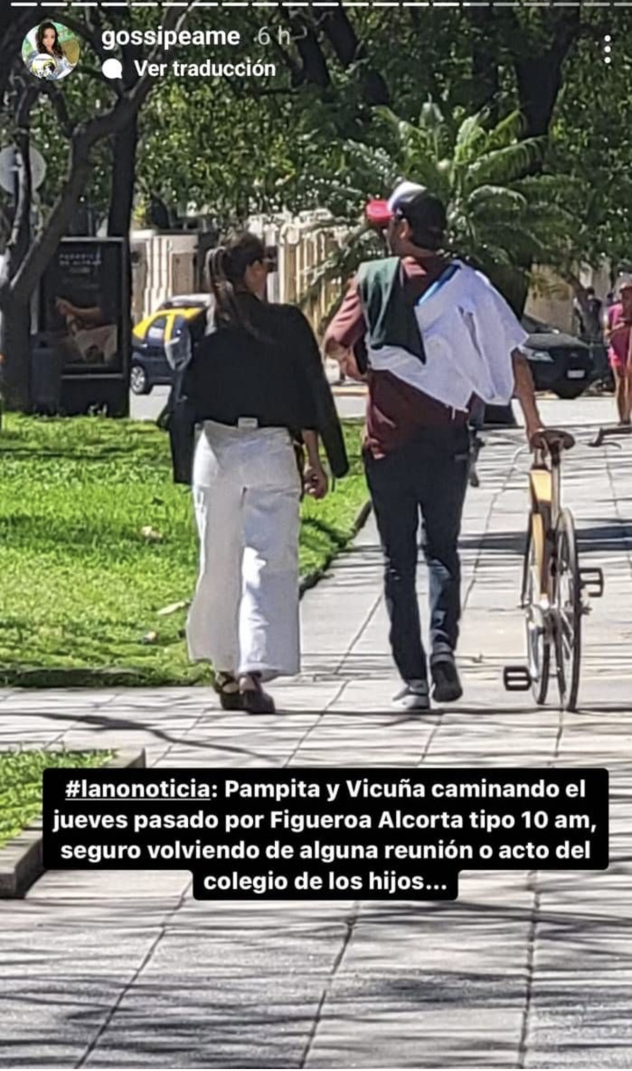 "Pampita y Vicuña caminando el jueves pasado por Figueroa Alcorta tipo 10 am, seguro volviendo de alguna reunión o acto del colegio de los hijos", difundió Pochi, de Gossipeame.