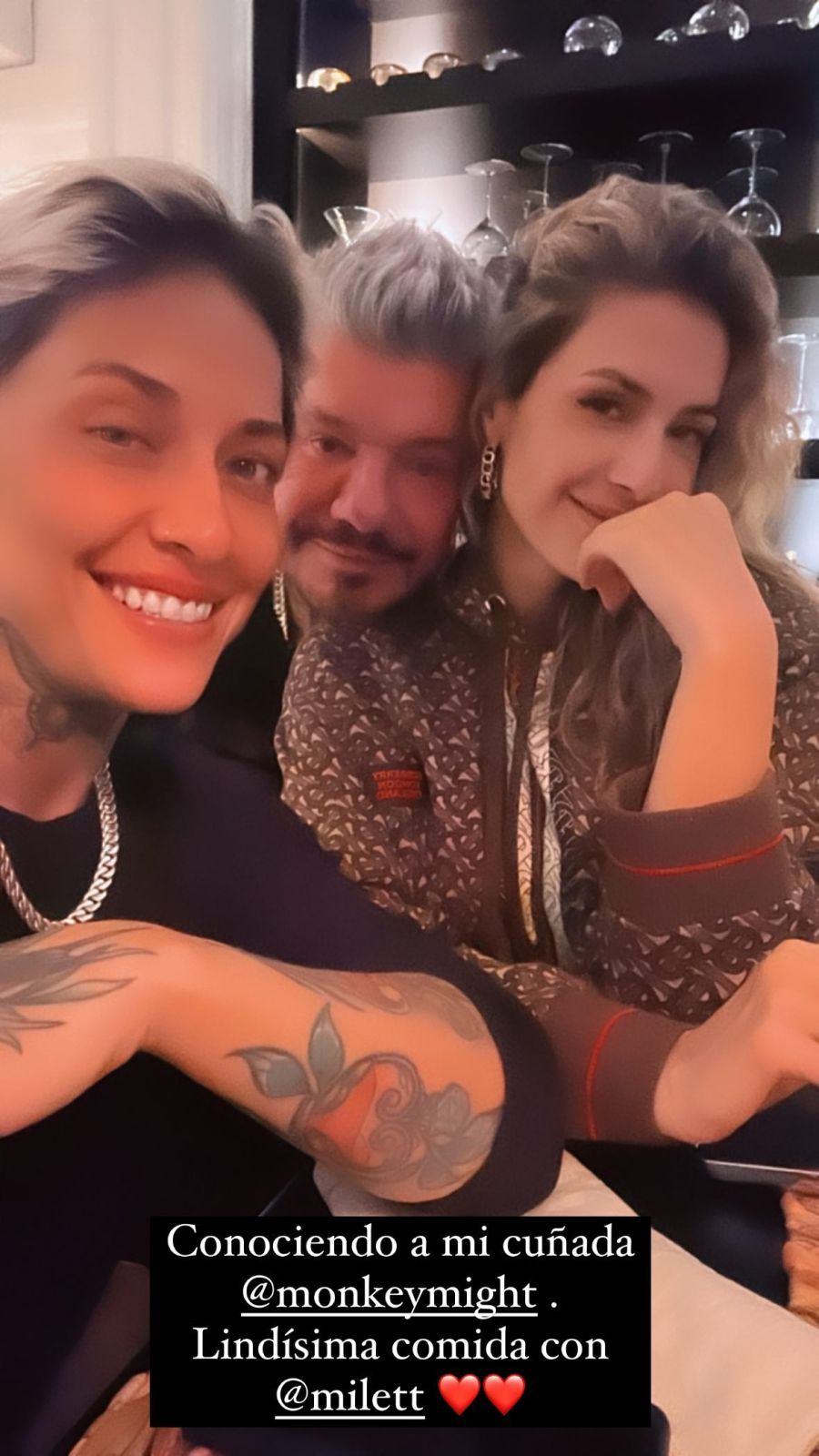El sábado por la noche, Tinelli compartió en sus redes sociales una imagen reveladora acompañada de la frase "Conociendo a mi cuñada". En la foto se ve al presentador junto a Milett Figueroa y a su hermana Maia.