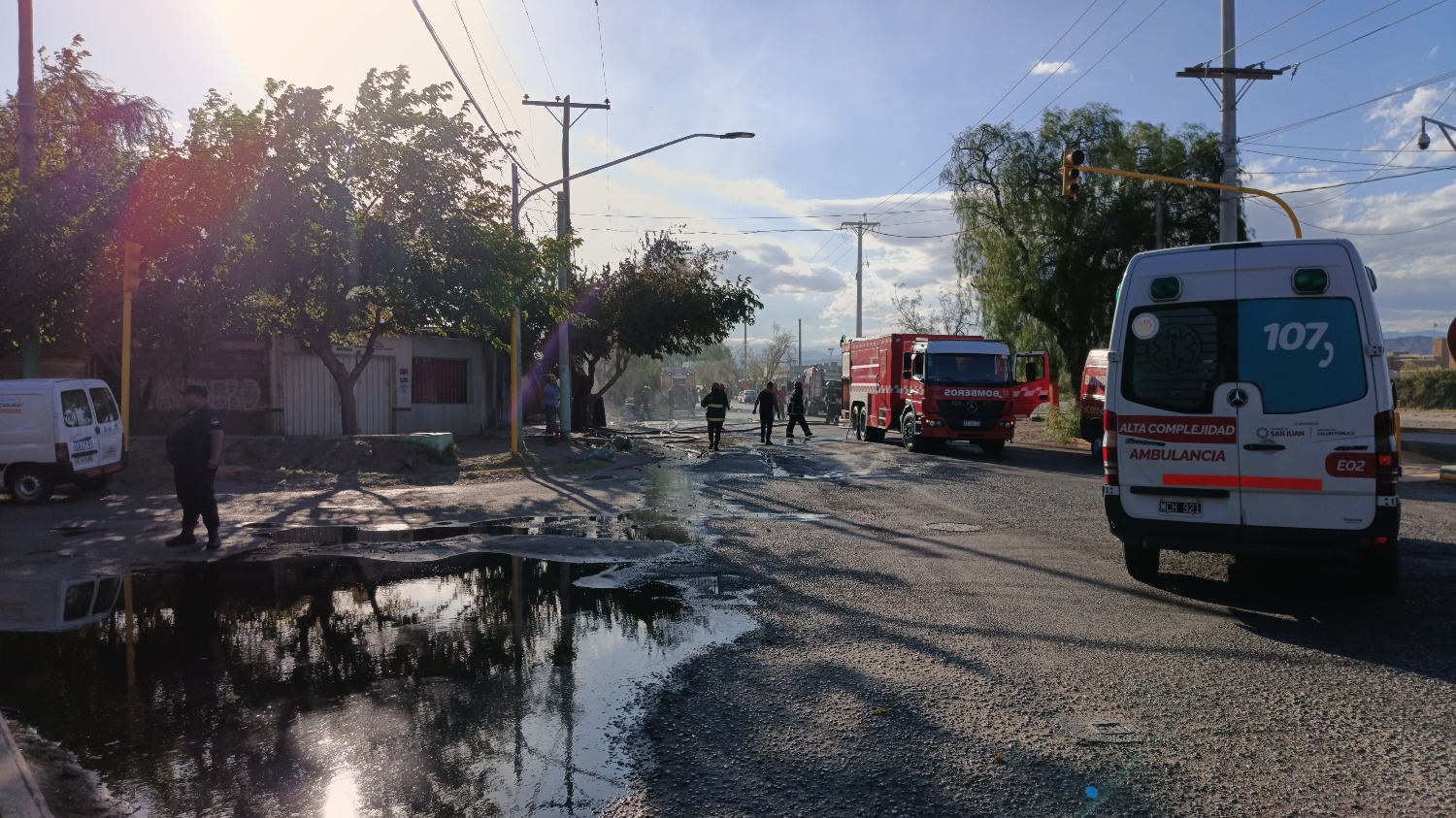 El fuego rápidamente tomó parte del arbolado, algunas casas aledañas y la explosión derribó un poste de luz. El hecho causó conmoción en los vecinos que salieron a la calle, la preocupación escaló por la rapidez que tomó fuerza el fuego y preocupación por las personas que viven cerca, que según testimonios aportados a DIARIO HUARPE, eran adultos mayores.