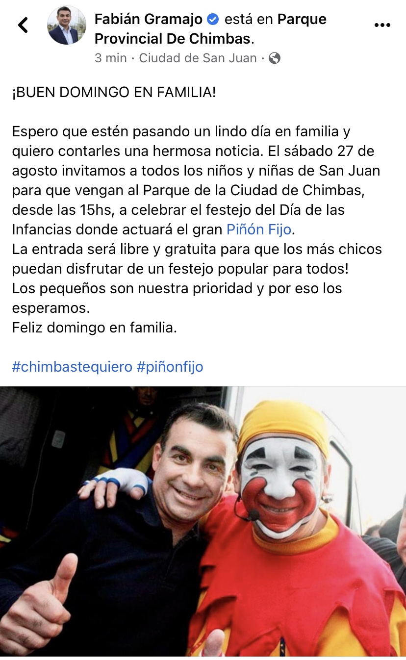 La noticia fue confirmada por el propio intendente Fabián Gramajo quien manifestó que los niños son prioridad para la gestión y de esta manera buscan regalarles alegría. Gramajo también dijo que “hay muchas veces que los papás no pueden pagar una entrada para el teatro o el cine, por eso este espectáculo será gratuito para que disfruten las familias completas”. El primer mandatario municipal lo publicó en sus redes sociales, donde tiene gran alcance:
