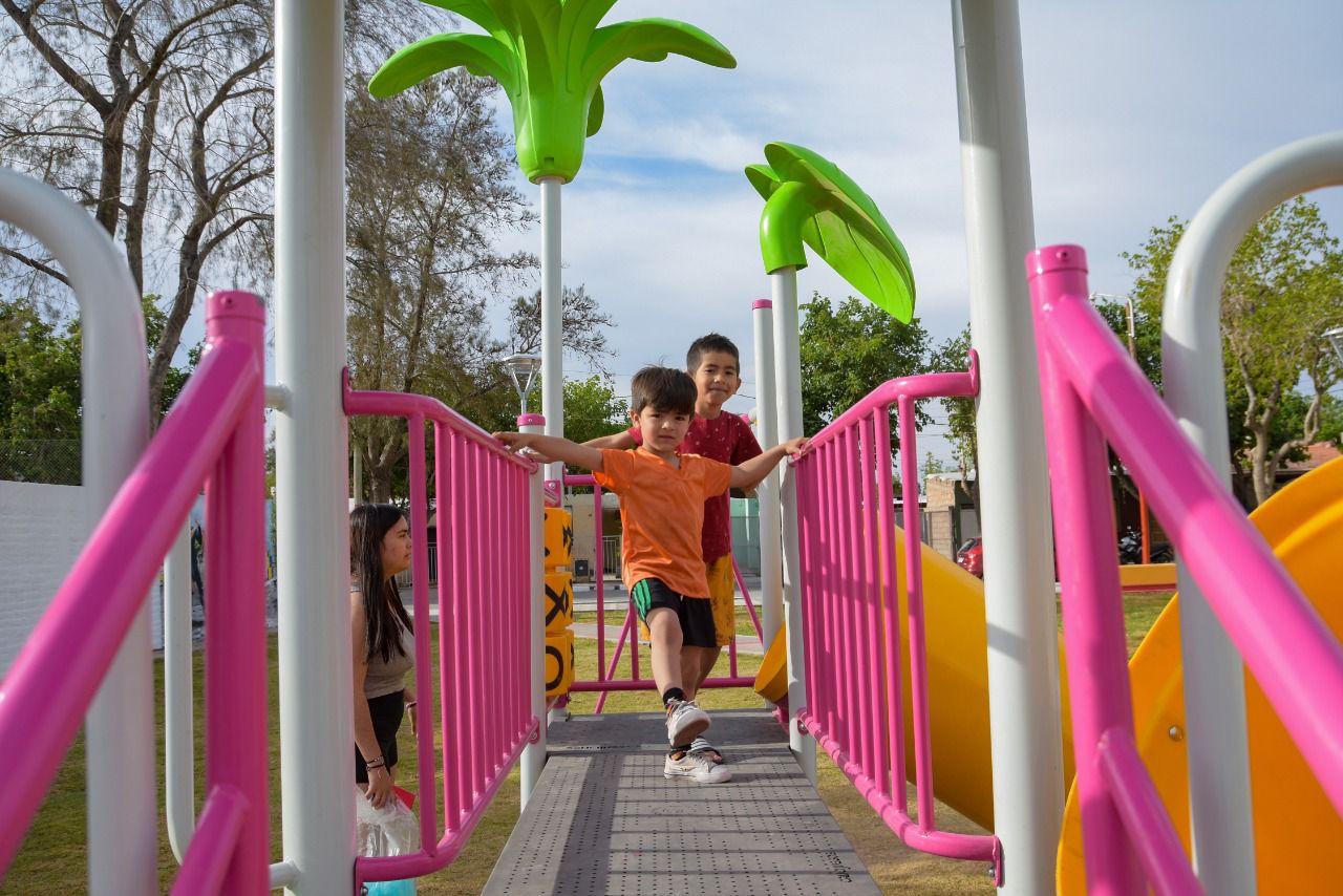 Allí se instalaron juegos para los más pequeños como mangrullos, torres con hamaca, trepador, tobogán, sube y baja. Además se construyeron rampas de acceso, bancos de descanso y cestos de residuos; como así también realizaron trabajos de parquizado, mejoramiento de gruta, revestimiento en piedra bola y se realzó toda la obra con la pintura de todo el lugar. Así también se construyeron veredines con hormigón peinado y cordón zapata en los alrededores.