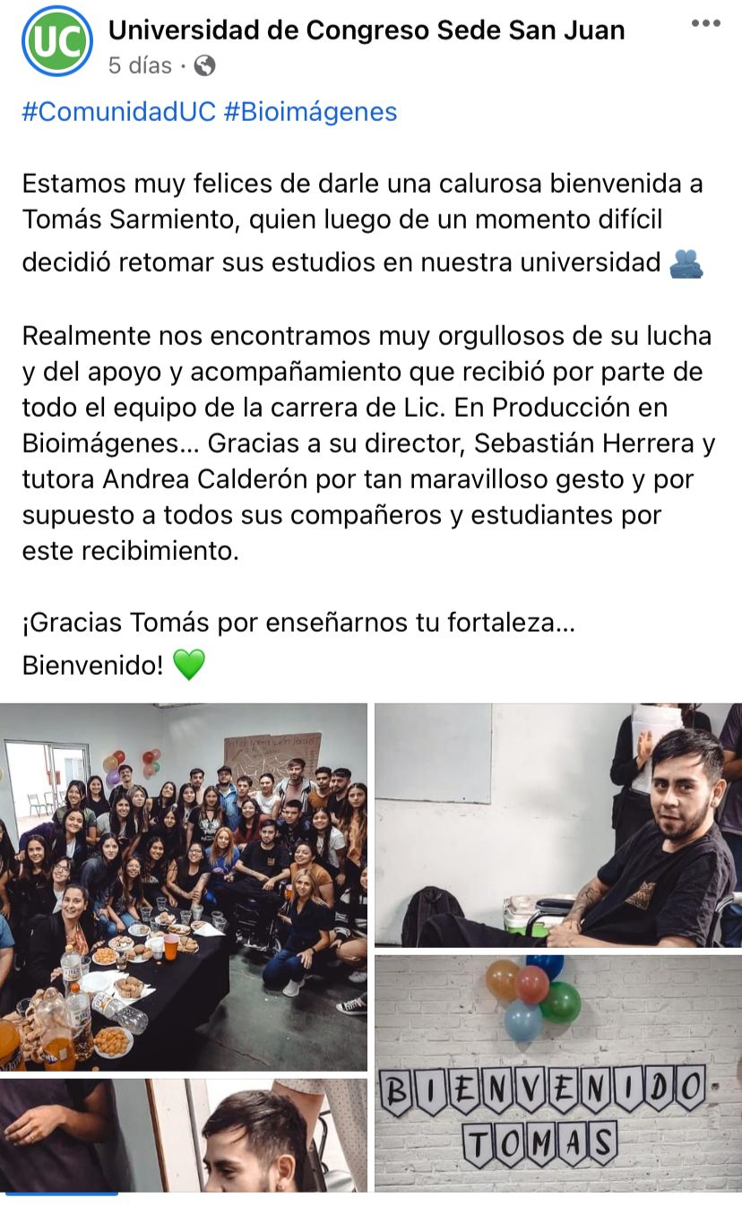 Hace unos días la vuelta de Tomás a la Universidad repercutió en redes sociales ya que tuvo un cálido y amoroso recibimiento por parte de sus docentes y compañeros ya que el joven tuvo que dejar sus estudios luego de accidente y luego de 5 meses pudo retomar su carrera universitaria.